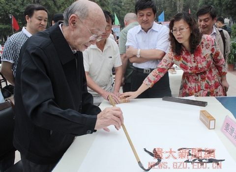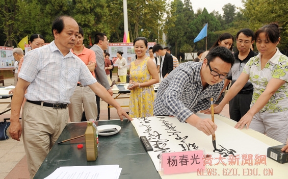 新闻网讯 (实习记者 孙丙坤 报道 摄影|陈恒 包象莹) 9月23日下午,贵州大学“多彩贵大·和谐校园”教职工书画摄影展启动仪式在大礼堂前举行。校长郑强、校党委副书记冯晓宪、副校长吴次南、校纪委书记杨伟民出席启动仪式。工会常务副主席肖丽萍主持启动仪式。