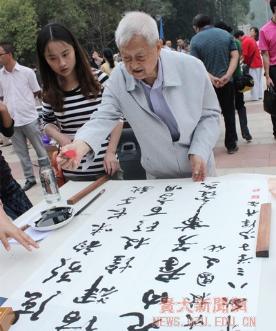 冯晓宪副书记致辞。他首先对各位老先生、老专家的到来表示欢迎。他说,刚刚送走了第二十九个教师节,送走了中秋佳节,我们又将迎来中华人民共和国成立64周年华诞。在这丰收的季节,贵州大学举行“多彩贵大·和谐校园”教职工大型书画摄影展,是我校为中华人民共和国成立64周年华诞献上的贺礼。冯晓宪副书记勉励大家通过这次书画摄影展深入基层、深入群众,创造出既生动活泼,又体现社会主义先进文化的优秀作品。