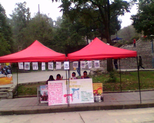 新闻网讯(记者团 保丹东 实习记者 杨军 摄影报道)10月21、22日,贵州大学花溪南校区新长城自强社“善行100”志愿者招募活动在食堂门口摆点招新。