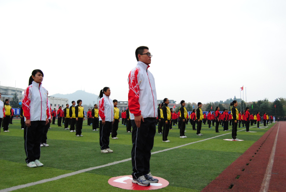当学生们在赛场上展现自己的青春热血时,教师们也不甘落后。早上九点,体育节开幕式后的第一个比赛项目就是教职工第九套广播体操竞赛。平日里严谨治学老师们脱去颜色暗淡的正装换上鲜艳醒目的运动服,在操场上列队整齐,他们动作一致步伐协调,跟着音乐每一个动作的准确到位。