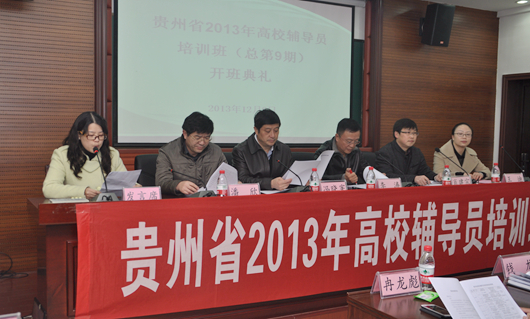 新闻网讯(记者 庞爱忠)12月9日,贵州省2013年高校辅导员培训班第九期开班典礼在我校逸夫楼322教室举行。省委教育工委副书记李涛,校党委副书记冯晓宪出席并讲话,来自全省44所高校的78名辅导员参加培训。校学生工作部(处)长肖建宗主持开班典礼。