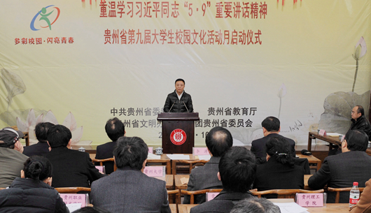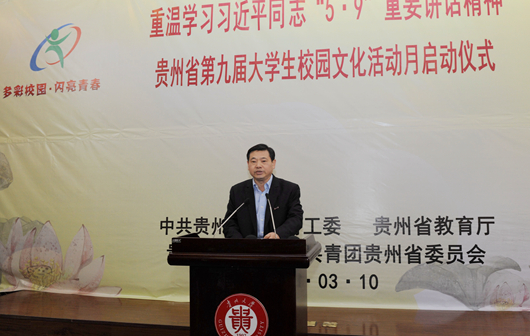 校党委书记姚小泉致欢迎辞。他说,在第九届“多彩校园• 闪亮青春”全省大学生校园文化活动月中重温学习习近平总书记“5•9”重要讲话精神,对学校进一步弘扬中华优秀传统文化,激励青年大学生立志成才,推动有特色领军型高水平大学建设,具有重要而深远的意义。贵州大学一定按照省委省政府的要求,在省委教育工委的指导下,以重温学习习近平总书记“5•9”重要讲话精神为契机,以深入开展党的群众路线教育实践活动为切入点,在“深化”上下工夫,在“研究”上下功夫,在“转化”上下功夫,切实将重温讲话精神与推动实际工作紧密结合起来,办人民满意的大学。