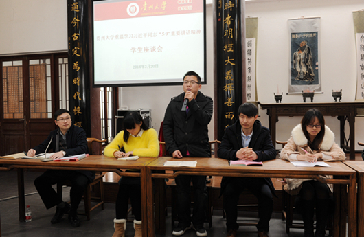 贵大新闻网讯(王晓春 记者团 乔吉鹏 张忠海)3月20日下午,贵州大学重温学习习近平同志“5•9”重要讲话精神学生座谈会在学校中国文化书院勉学堂举行。校党委书记姚小泉、副书记冯晓宪出席,学校相关职能部门负责人以及来自各学院、研究生培养单位共100余名学生代表参加了座谈会。座谈会由学生工作处处长肖建宗主持。