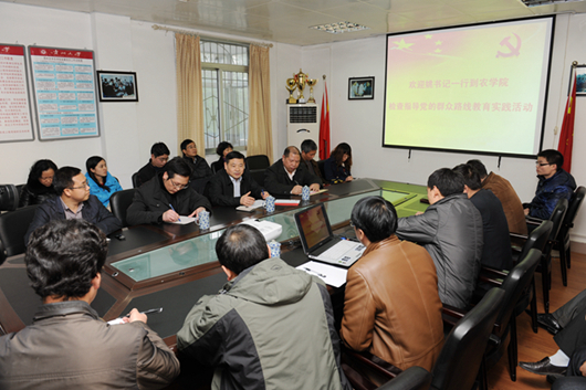 贵大新闻网讯(杨波) 在我校党的群众路线教育实践活动深入开展之时,校党委书记、校党的群众路线教育实践活动领导小组组长姚小泉,副校长、校党的群众路线教育实践活动领导小组成员赵德刚于3月24日下午来到农学院调研指导工作。姚小泉指出,农学院要坚持“服务性、适应性、导向性”相统一的办学思路,把握“多学科、应用性、教学型、高水平、有特色”的办学定位。
