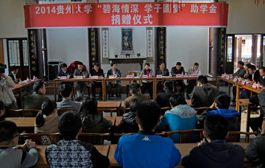 贵大新闻网讯(记者团 肖宗信|摄影 査方芳)随着我校党的群众路线教育活动的深入开展,学生资助管理中心急家庭经济困难学生之所急,想家庭经济困难学生之所想,积极联系爱心企业和个人,在贵阳市关山湖区碧海社区的“牵线搭桥”下,经过校区双方多次协调对接, 3月27日下午,以贵州省浙江总商会为代表的八家企业及捐资个人来到我校文化书院举行“碧海情深 学子圆梦”助学金捐赠仪式。校党委副书记冯晓宪,贵州省浙江总商会党委副书记、会长张其鹤,碧海社区党委书记崔向前分别致辞。