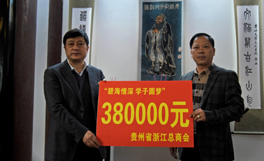赠牌仪式上,贵州省浙江总商会党委书记陈瑞国,贵阳市缆圣电缆有限公司总经理孙聚友,贵阳君尚酒店管理有限公司董事长姚正满,贵州英思普瑞信信息技术有限公司总经理张鑫,贵州丹霞城环保科技有限公司总经理文春生,个人捐资助学者李逢春、衡顺全、姜生国分别向贵州大学颁发”碧海情深 学子圆梦“助学金捐赠牌。贵州大学党委副书记冯晓宪教授代表学校接受捐赠牌,共接受捐赠合同金额90万元,分四年实施。