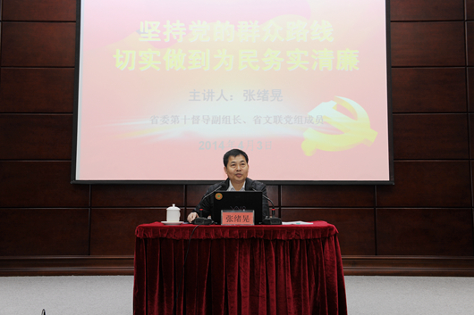 张绪晃结合中国共产党成立以来党的几代领导集体关于群众路线的重要论述指出,党的群众路线是党的生命线、传家宝,党取得人民信任的根本在于为民务实清廉。他从我国改革发展面临的国内外挑战和党的建设面临的巨大压力等方面,分析了开展党的群众路线教育实践活动的重要性和必要性。