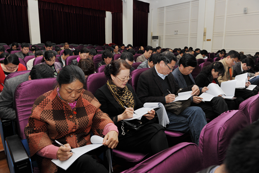 姚小泉所作的干部选拔任用工作报告结束后,全体参会人员对学校2013年干部选拔任用工作情况和新提拔的干部进行了民主评议。