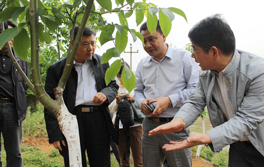 4月26日上午,姚小泉一行来到兴仁县巴铃镇,深入贵州大学与贵州省洪黔薄壳核桃有限公司合建的核桃产业基地调研。他看到我校农学院教授潘学军的“黔核”系列核桃新品种及国家专利技术在兴仁县“开花结果”时,关切的询问潘学军教授在黔西南州与农业龙头企业在核桃产业领域的技术服务情况,了解低产核桃大树高接换优的难点和优势,对核桃高接换种技术对贵州核桃产业健康发展的促进给予了积极肯定。姚小泉指出,在党的群众路线教育实践活动中,贵大专家教授们就该如此“接地气”,真正走到田间地头,实实在在为群众办好事办实事。