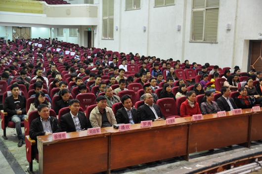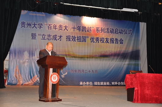 贵大新闻网讯(招生就业处)为进一步弘扬和传承“百年贵大”精神,总结回顾2004年新贵州大学组建十年来的发展历程,引导学生树立崇高理想。4月29日下午,“百年贵大 十年跨越”系列活动启动仪式暨“立志成才,报效祖国”优秀校友报告会在北区礼堂举行。报告会邀请贵州大学优秀校友,现任中共贵州省委党史研究室主任的徐静为师生们作报告。副校长赵德刚出席报告会。学校相关职能部门、学院负责人,辅导员代表及近千名学生代表参加报告会。报告会由承办单位招生就业处处长惠淑林主持。