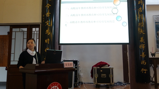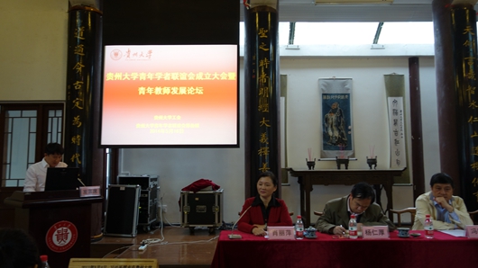随后的贵州大学青年教师发展论坛由喀斯特环境与地质灾害防治教育部重点实验室常务副主任安艳玲教授主持。论坛分为材料与冶金学院副院长向嵩教授的平台建设与大学青年教师发展、管理学院副院长王婷教授的高校青年教师压力之下如何突围、中国文化书院马国君教授的大学传统与学术传承、马克思主义学院副院长、分工会主席、颜茵副教授的高校青年教师再教育与可持续发展的认识四部分主旨发言。