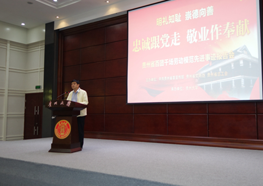 贵大新闻网讯(校工会)5月19日下午,由省委宣传部、省文明办、省总工会主办的“明礼知耻•崇德向善——忠诚跟党走 敬业作奉献”贵州省百团千场劳动模范先进事迹巡回报告贵州大学报告会在我校北区行政楼报告厅举行。校党委副书记冯晓宪,省总工会党组成员、纪检组长胡茜,省总工会宣教部部长赵福中出席,劳模代表团、学校相关职能部门负责人、各学院师生代表参加报告会。校工会常务副主席肖丽萍主持报告会。