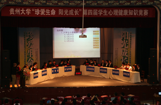贵大新闻网讯(记者团 赵曼)25号下午,贵州大学“至善杯”第九届5.25心理健康活动之“珍爱生命 阳光成长”第四届学生心理健康知识竞赛决赛在我校北区大礼堂内举办。校党委副书记冯晓宪作为嘉宾出席比赛,学生处处长肖建宗、副处长冉龙彪,党委宣传部副部长徐炼等部门负责人陪同观看了比赛。我校人事处处长王颖华,党委组织部副部长杨楠,心理咨询中心副主任杨戈老师担任比赛评委。
