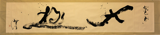 在美术馆二楼展厅,姜先生一幅长约10米、宽约1.5米的书法作品《太极》吸引了众人的眼球。“太极”二字气势磅礴,一气呵成,仿有浑然一体之元气流淌其中。“极”字之“木”字偏旁又如一人正在舞动太极拳,翩然若画。整副作品浑融流转,书画合一,道法自然之妙境跃然纸上。
