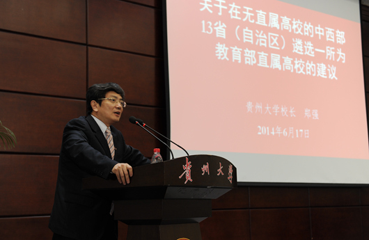 郑强作主题报告。他详细分析了河北、河南、江西、海南、广西、贵州、青海、云南、山西、新疆、宁夏、西藏、内蒙古等中西部13省(自治区)无教育部直属高校的现状,阐述了13省(自治区)高校的困惑与困境,进而希望13省(自治区)高校特别是入选“中西部综合实力提升工程”的14所入选高校团结协作、积极呼吁,积极促成在13省(自治区)分别遴选一所高校为教育部直属高校,纳入中央政府(教育部)直属高校管理体制,直接由中央财政拨款建设。郑强认为,若13省(自治区)都有教育部直属高校,对其他地方高校将具有示范作用,具有人才培养和引进“固根”、“播种”、“培苗”的关键作用,具有先进科技“发源地”、产业调整升级“加速器”和高端人才“吸引盆”的引领作用。