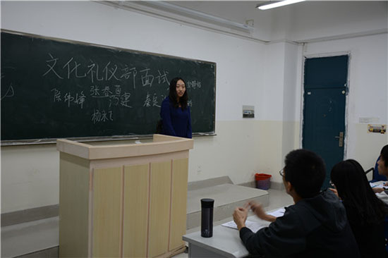 其中,文化礼仪部、实践部、学习部的面试候场地点是202教室,同学们坐满了整个教室,报名表摞在前排桌子上,参加面试的同学按照顺序签到等待,由部门负责人按秩序带到指定面试的教室。文化礼仪部负责人孙露熙说:“面试中的自我介绍和是否自愿购买高跟鞋、化妆品等物品很重要。”“针对不同的学生要问不同的问题,因人而异。”学习部负责人卢林雪说。