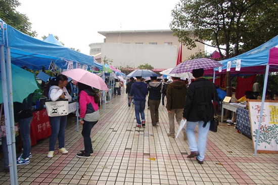 贵大新闻网讯 (记者团 杨顺 实习记者 杨柳燕 付鼎 报道|摄影 任倩 实习记者 杨柳燕) 10月17日,南校区百团招新第二天。各社团像往常一样,摆点进行招新。10点左右,天空下起了小雨,气温骤降。南区各社团却依然坚守在招新点,等待有意向加入自己社团同学的到来。正如礼仪部副部长黄蕾所说:“下了雨也没关系,我们将会继续招新,坚守于自己的岗位,风雨无阻,等待新力量的加入”。