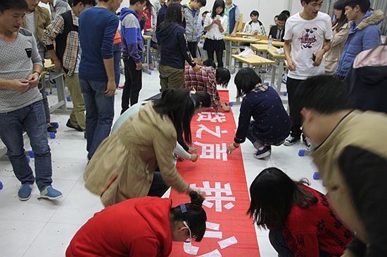 一张地图究竟为什么会有这么多人的签名呢?经过记者的调查,了解到学校一年一度的“诚信”主题班会评比又要开始了,工程131班在班委集体商量后想出了这么一个有趣的活动——“诚信地图”。他们提前一天将2米乘2米的地图打印出来,然后将各个省份剪裁出来,为了方便拼图,他们还在每个省份的背后粘上了硬卡纸。