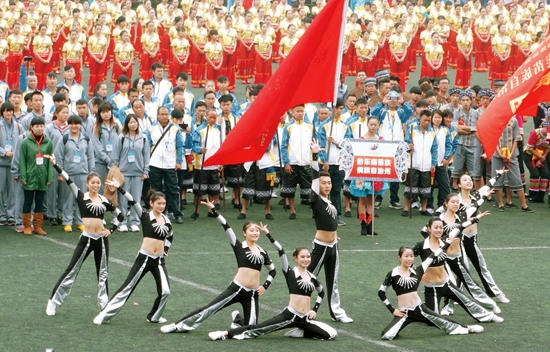 开幕式上,我校代表团在我省高校中首个入场。在主持人对我校代表团简介完毕。《潇洒小姐》舞曲响起,我校健美操队为在场领导和来自不同区域的健身操队员表演有氧舞蹈四级动作,队员们精神饱满、动作优美,获得在场嘉宾的阵阵掌声。据了解,我校健美操队为参加此次开幕式,训练了整整两个星期。