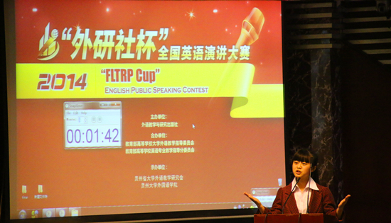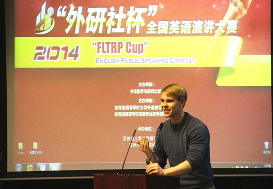 贵大新闻网讯 (记者团 陆瑶 实习记者 陈晓露 周佳颖 报道|摄影 周思宇) 10月24日下午,2014年“外研社杯”英语演讲比赛贵州大学赛区复赛在我校北区模拟法庭举行。参与此次比赛的评委有校党委宣传部副部长崔东明,教务处副处长胡宗超,“外研社杯”贵州赛区组委会主任王健芳,外国语学院教授宁梅,副教授田金美、老师黄媛和陈娟,提问评委由外国语学院副教授黎晓容和外教Alex担任。