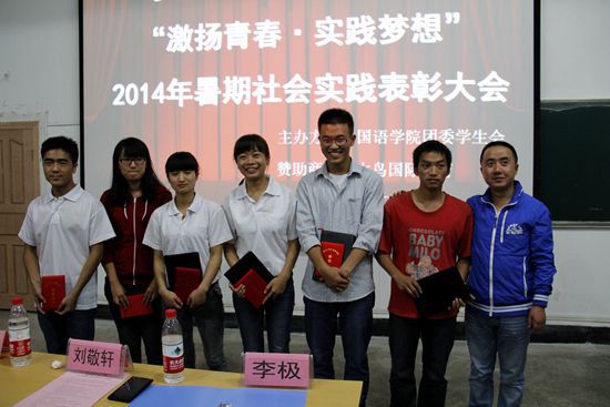 大会在一段《实践是什么?》的视频中开始。视频中,日语142班的李智、2012级翻译专业的杨运、翻译131班的周卉玲等同学发表了他们对实践的看法。2012年参加了习水支教、2013年“蓝”梦携爱突击队副队长、2014年“屯”梦青年突击队队长项宇说:“大学生需要跟着实践队伍走一次。”