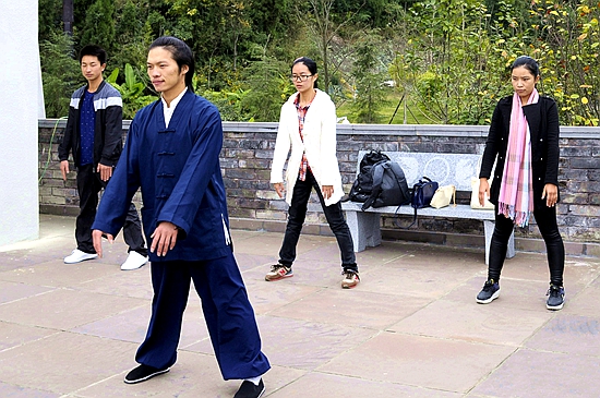 讲学开始前,主讲人化宇带领一些国学社成员在明伦堂前打太极。化宇说:“带领大家打太极,原因之一是有一些同学对太极很感兴趣,但最主要原因还是今天讲的是王阳明的知行合一,而道家的太极中所蕴含的养生养心之理正与此有相通之处。打太极的主要目的在于在太极中静心,使大家能更好地参与到阳明读书会中。”他说,“在做学问前要先静心。”