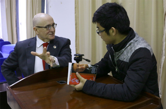 讲座开始,Carooll教授向大家介绍了美国的教育机构以及美国大学的特点。“美国学生并不靠学校的排名来选择大学,而是看是否适合自己,适合的才是好的。”他说。对于中美教学差异,Carooll教授说:“我感觉中国的学生都很听话,甚至回答问题都是老师点名回答。而在美国,课堂氛围很活跃,师生关系很融洽。”在介绍完美国阿尔法联盟后,他向大家说明了该联盟与我校旅游与文化产业学院的留学合作项目“The 1+1 MBA program with Guizhou University”,并解答大家的疑惑。