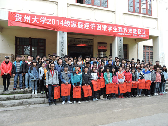贵大新闻网讯 (记者团 徐松 实习记者 谭戊梁 报道|摄影 聂青) 11月10日下午,我校阳明学院2014级寒衣发放仪式在南区同心楼前顺利开展。阳明学院党委书记余颖、党委副书记李耘、党委副书记王平判、校资助管理中心副主任陈义、郑岚以及50名阳明学院辅导员、各教学部受助学生代表参加仪式。王平判副书记主持本次活动。