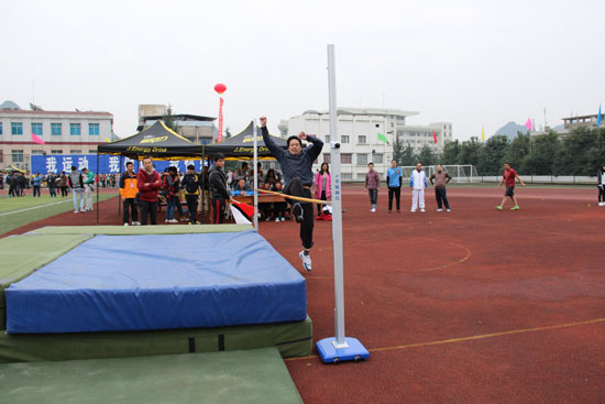 比赛采用现场报名的方式,原定分为青年组(30岁以下)和老年组(30—40岁),每组五人以上方可开赛,但因报名的教职工人数有限,最终合并为一组开赛。起跳的杆高定为1.1米,每位教职工分别有三次机会。第一次试跳结束后,何畅、徐练、田鑫三位教职工顺利通过,观众喝彩不断。裁判提醒说:“注意不要双脚跳,要单脚完成!”三次试跳后,一位教职工被淘汰。第二场杆高为1.2米,三次试跳后,决出冠军为何畅老师。党委宣传部的副部长徐练、田鑫老师并列第二,党委宣传部的丁龙、法学院的阮志群老师并列第四。