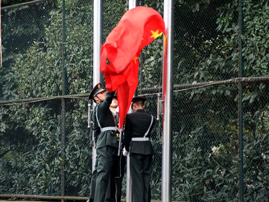 上午9时许,一群身着戎装的国旗护卫队高举手中的五星红旗与我校校旗,率先步入运动场内接受检阅。伴着庄严的国歌,国防生饶开林熟练的挥手展旗、敬礼,神情肃穆。护旗手有节奏的拉动绳索,其余26人分为两列,面朝国旗敬礼。礼毕,他们喊着响亮的口号,踏着统一的步伐,有序离场。