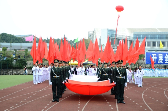 贵大新闻网讯(记者团 王名润 陆瑶 实习记者 李宇轩 樊宏俊 辛思远 丁雪微 付鼎 报道|摄影 丁奕辉)11月13上午,我校第十届体育节在北区体育场开幕。38支代表队相继亮相,与此同时,我校国旗护卫队参与到开幕式的入场队列演练与升旗仪式中。