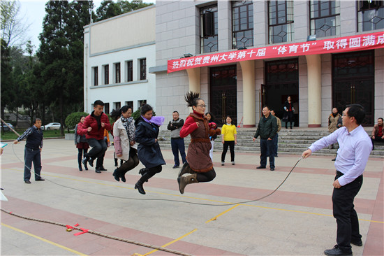 贵大新闻网讯(记者团 张忠海 实习记者 张小翠 报道|摄影 孙丽)11月14日上午,贵州大学第十届“体育节”教职工趣味竞赛—贵州大学工会与贵州大学党委宣传部场在北校大礼堂前进行。趣味体育竞赛分为拔河、集体跳绳两个项目。