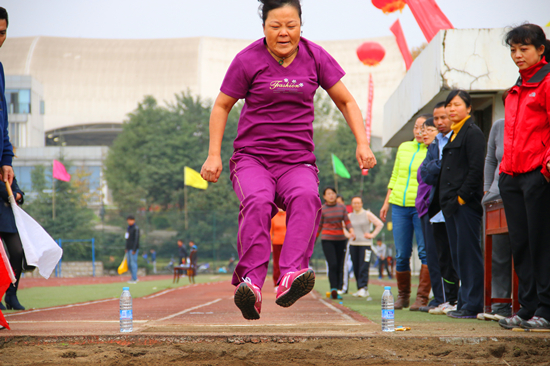 第一次跳远,来自马克思主义学院的钟华老师,助跑前半段用大步跑,后半段用小碎步在起跳线前奋力跳跃。2米72!钟老师对这个成绩感到十分惊讶,其他老师都送来掌声。来自后勤设计院的陈玉红老师第一跳时尽全力跳进沙坑,结果平衡没有把握好,身体向后倾倒,完全坐进沙坑,像一个不倒翁在沙坑里摇晃起来。这又引得现场一阵欢笑。陈老师也自嘲道:“我有些喜欢上这个沙坑了。”第三跳时陈玉红老师吸取上次“出丑”的经验,把握好跳进沙坑时的平衡,最终跳出2米64的成绩,位列第二。