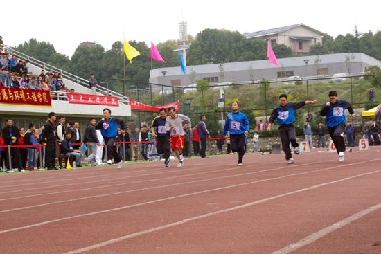 “各就各位,预备”伴随着发令员的口令,运动员们半蹲着,身子呈前冲姿势,发令枪一响,运动员们如箭在弦飞射而出,步伐轻盈,矫健迅速,看台上各学院的啦啦队在摇旗呐喊,为运动员助威加油。