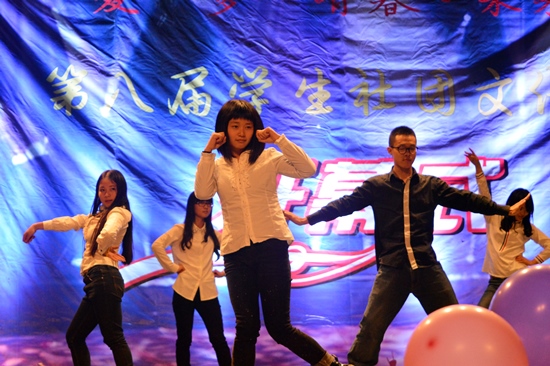 接下来,舞蹈爱好者协会带来了爵士舞《blow》,动感的音乐和活力十足的舞姿瞬间点燃现场气氛;社联组织部同学们带来了民族风味十足的舞蹈《土家族摆手舞》,带领大家领略了少数民族独特的庆贺方式;在古朴典雅的配乐中,汉风府的汉服舞蹈《礼仪之邦》走进观众视线,优美的舞姿引来阵阵掌声;武术协会的表演《棍武青春》,在雄壮、豪迈的配音下登场,表演者先后使用了双节棍、刀、长棍等道具,现场呐喊声、喝彩声不断。小德云社的相声表演《我要奋斗》,引得观众笑声连连;社联办公室的舞蹈《校园华尔兹》,呈现了当代大学生的朝气;,维忽拉之家的吉他弹唱《平凡之路》让观众们陶醉;轮滑协会舞蹈《轮舞飞扬》,精湛的轮滑技术博得了晚会最热烈的掌声。