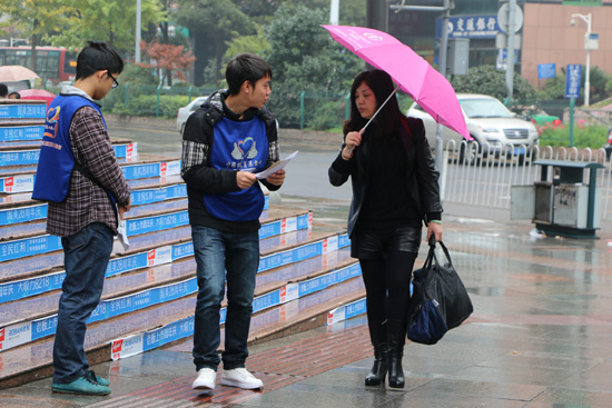 天还下着小雨,志愿者们冒雨站在路边,一一向过往的行人介绍“2014善行100·用爱温暖冬天”这个活动,希望能为山区孩子募捐到爱心包裹。