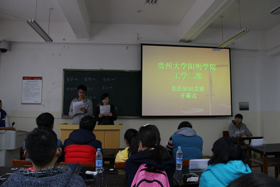 贵大新闻网讯 (记者团 但茜 实习记者 丁宁|摄影 张纪红) 11月22日早,阳明学院工学二部宪法知识竞赛在我校南校区致知楼610教室举行。据悉本次比赛由阳明学院工学二部团总支学生会组织,比赛共19个队参赛,每队4人,共分为3组,每组前两名进入复赛,复赛选出4支队伍进入决赛,决赛评出前三名,并由第一名参加阳明学院的知识竞赛。比赛还将颁发个人优秀奖。