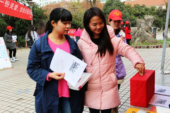 “银鸽”志愿者服务团爱心服务部部长李航表示:“‘滴水汇成大江,碎石堆成海岛’,一元钱对于许多学生微不足道,可是把它们汇集起来能帮助许许多多的贫困孩子,或许能改变他们一生的命运。”她转身微笑着看看身后的部员,继续说,“我们爱心服务部积极性很好,很多人都没有吃饭就来这儿帮忙号召他人募捐,很高兴南区的同学都积极配合,让我感到很温暖,似乎看到了贫困儿童的未来,我非常感谢每个怀有爱心的人。”