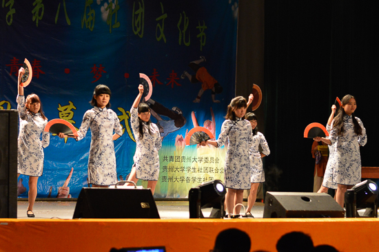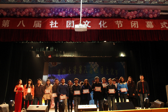 贵大新闻网讯(记者团 何瀚章 实习记者 付鼎 报道|摄影 赵会 蒋佶宏)12月7日晚,以“爱·青春·梦·未来”为主题的第八届社团文化艺术节闭幕式在我校北区大礼堂举行。本次活动由共青团贵州大学委员会主办,贵州大学学生社团联合会承办,贵州大学各学生社团协办。校党委宣传部副部长崔东明、校团委科技实践部部长、社联指导老师杨乐、校团委宣传部部长廖银出席了闭幕式。