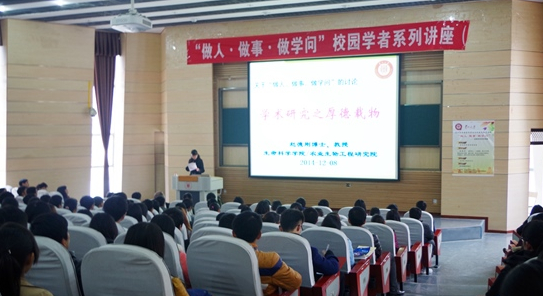 贵大新闻网讯(生命科学学院 徐育兰| 杨安美 钟灿辉 摄影)为进一步提升我校大学生道德素养和文化内涵,引导学生树立正确的人生观、世界观、价值观。12月8日,由我校学生工作部、国家大学生文化素质教育基地主办,生命科学学院承办的以“做人•做事•做学问”为主题的校园学者系列讲座活动在西校区圆形报告厅举行。副校长赵德刚教授作了题为“学术研究之厚德载物”的专题讲座。生命科学学院党委副书记令狐莹主持讲座。校学生工作部副部长王迪、化学与化工学院党委副书记杨静等以及近300名师生聆听了讲座。