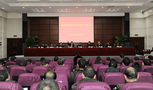 贵大新闻网讯(实习记者 王璇)12月29日,我校在北区行政楼报告厅召开2014年科技工作会议,传达贯彻中央和贵州省相关精神,讨论总结我校2014年科研工作,研究部署2015年科技工作安排。校长郑强、副校长宋宝安、王红蕾、赵德刚、向淑文、李军旗、张覃,总会计师谢田凯出席会议,马克俭院士应邀出席会议。学校各学院分管科研负责人、校直科研机构负责人、科研秘书(教学科研科科长)、学科学术带头人、学术骨干代表、2014年新引进博士等参加会议,副校长宋宝安主持会议。