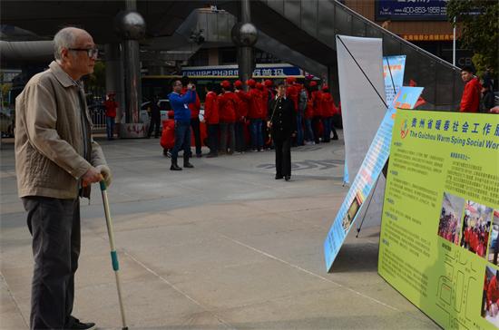 贵大新闻网讯 (记者团 夏赛楠 摄影报道) 3月21日,贵州省民政厅、贵阳市民政局在贵阳市大十字广场举办2015年贵州省国际社工日宣传活动。省民政厅党组副书记、副厅长甄燕驰同志,厅党组成员、机关党委书记杨亚军同志,副巡视员肖劲同志和省文明办、团省委、贵阳市民政局等相关领导参加活动。