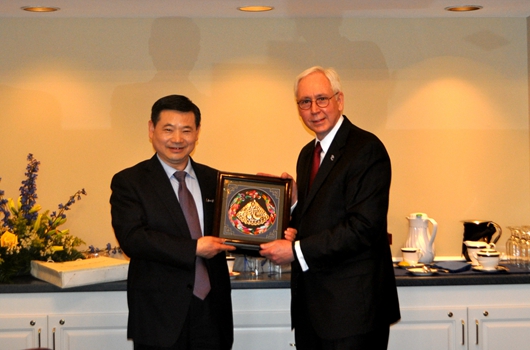 3月26日,代表团在美国访问的第二场活动是出席我校普莱斯比学院孔子学院董事会会议,并就进一步加强两校交流合作、扩大孔子学院发展规模等与普莱斯比学院克劳德•李力校长、普莱斯比学院孔子学院美方院长刘子华博士等进行了磋商。双方本着友好合作的精神、依照对等互利的原则,在认可孔子学院所做的积极贡献的同时,同意更新并加强双方在共建孔子学院所做的努力。经过友好协商,就两校友好合作达成了共识。姚小泉书记与克劳德•李力校长正式签署了《贵州大学和普莱斯比学院合作备忘录》,并互赠了纪念品。根据《备忘录》,贵州大学将继续加强与普莱斯比学院沟通,负责孔子学院中文教师的人事遴选与聘用工作;普莱斯比学院继续寻求机会,加大对孔子学院行政与技术支持、在校内拓展中文研究项目和中文课程,积极把双方的合作引向深入。