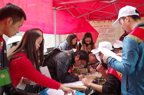 除了对禁毒知识进行宣传,本次活动还将对禁毒志愿者进行招募。据了解,凡是年满18岁,身体健康且乐于奉献、有社会责任感、能够利用日常空余时间自愿参与禁毒活动的大学生都可以报名。摆点桌上,有不少同学趴着填写报名表。