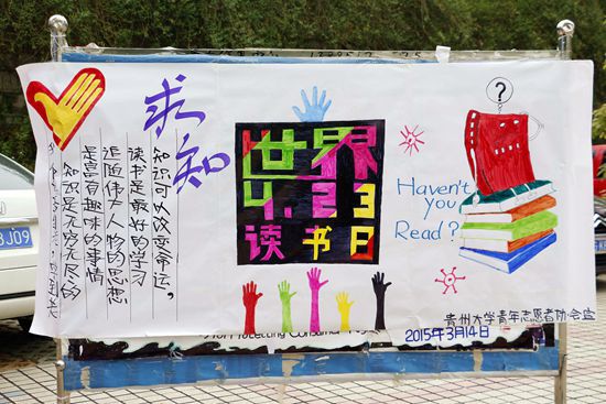 贵大新闻网讯 (记者团 张忠海 实习记者 张倩 报道 | 摄影 薛如冰)为培养大学生阅读兴趣,倡导回归纸质书籍,让读书成为人们终生追求的‘时尚’。 4月23日中午,由校青年志愿者协会主办的“4.23世界读书日”活动在南区食堂、北区中山园、新区食堂门口同时举行。