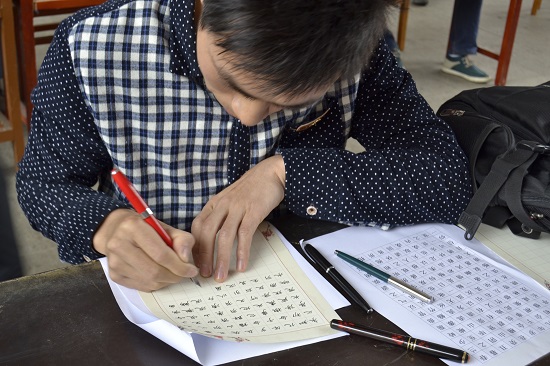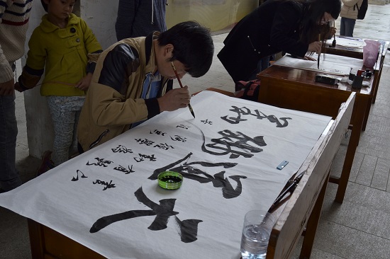 贵大新闻网讯 (记者团 覃会 实习记者 邓亮 报道|摄影 郭志野) 4月26日上午,由矿业学院团委学生会主办的“扬书法之光 创魅力校园”书法比赛在西校区东区食堂门口进行。