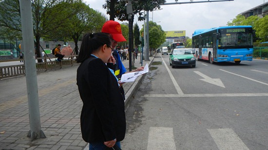 穿着红色的志愿者服装和黑色交警背心的志愿者们在十里河滩的大门处进行宣传活动。他们兵分两路,一部分志愿者走到不远处的路口,一边用身上所穿衣服提醒大家遵守交通规则、注意安全。一边向过完马路的行人发放宣传单宣传交通安全知识,并讲述因违反交通规则而发生的悲惨事故;另一部分志愿者用身体当做支点,将写有“平安出行每一步,关爱生命每一天”字样的横幅撑开向大家展示,红色的横幅和旁边多彩显眼的宣传板吸引不少路人驻足观看。