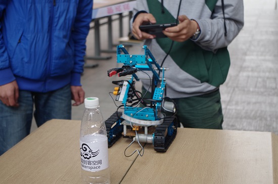 比赛进行了半个多小时后,来自机械学院的王铮和建筑与城市规划学院的郭志野率先完成了组装。但在操控机器人时却发现有一颗螺母在组装时松动,导致机器人无法按照指令行动。经过多番检查和改善,他们终于顺利的操控着机器人将空水瓶放入了瓶中,完成了比赛,用时53分钟。