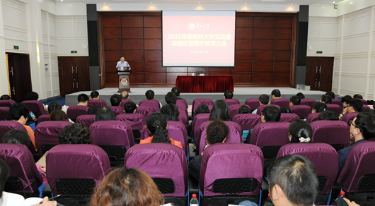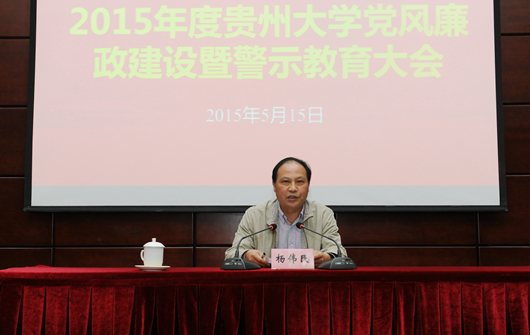 贵大新闻网讯(记者 梁恒贵)5月15日下午,贵州大学2015年度党风廉政建设暨警示教育大会在行政楼学术报告厅召开。校党委书记姚小泉出席并讲话。他指出,党的十八大以来,以习近平同志为核心的党中央将党风廉政建设和反腐败斗争提到一个新的高度,突出强调“有腐必反、有贪必肃”,要求以“踏石留印、抓铁有痕”的劲头,坚定不移深入推进党风廉政建设和反腐败工作,推动形成了全面从严治党新常态。