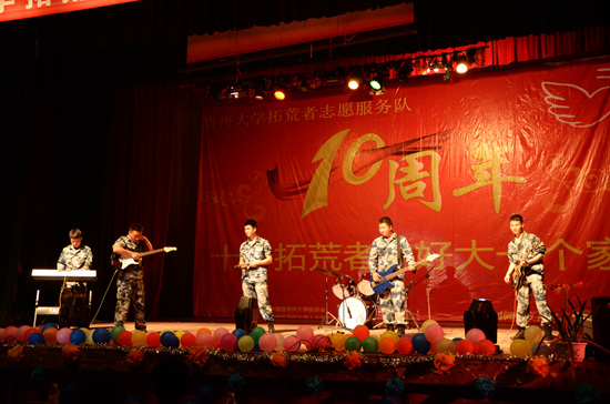 贵大新闻网讯 (记者团 付鼎 报道|摄影 丁奕辉) 5月15日晚,拓荒者志愿服务队10周年庆典晚会在南校区礼堂举行。校团委老师委廖银、贵阳空军场站的官兵及拓荒者志愿服务队相关负责人参加了晚会。本次晚会以“十年拓荒者 好大一个家”为主题。